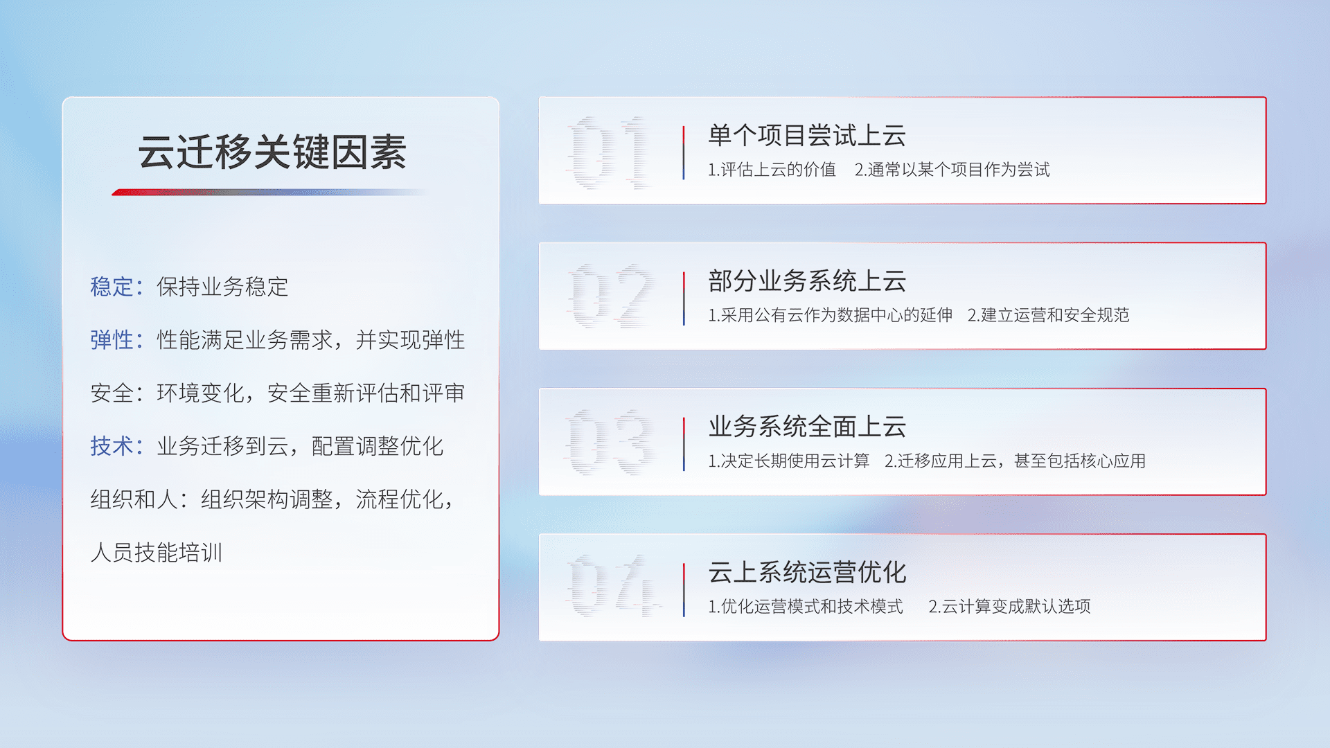 结合实际业务,,从规划设计、、、、云平台选型、、云原生改造、、、、数据迁移、、集成交付,,迁移全过程为客户识别最佳上云路径,,,,做好风险识别管理,,,设计网络架构、、、、身份权限、、安全审计合规、、、操作审计、、、、日志审计、、、、监控告警策略、、、多站点容灾设计等,,,,对云上基础设施进行整体规划,,,,提升IT治理水平,,以满足弹性、、、高可用、、高性能的需求。。。